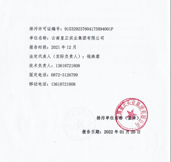 2022年云南皇正实业集团有限公司排污许可证季报 - 第四季度